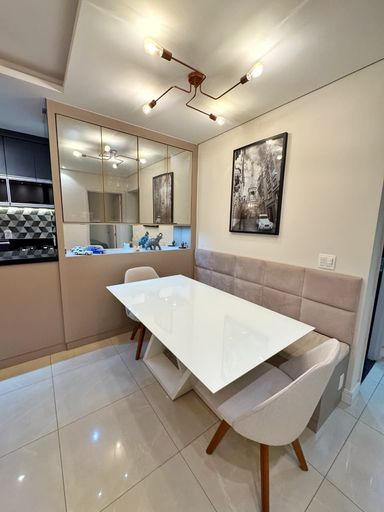 📌 Cristaleira com espelhos bronze, canto alemão acolchoado com baús, persianas sob medida