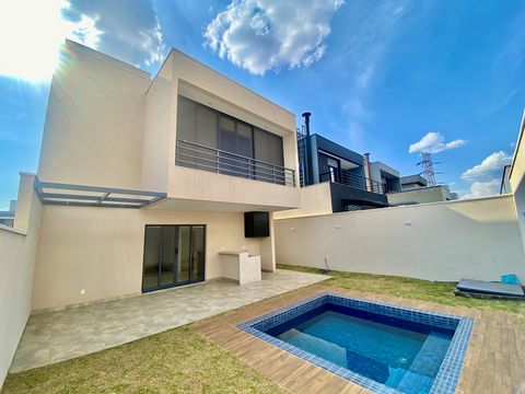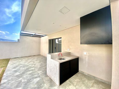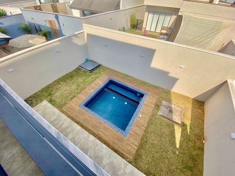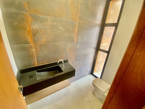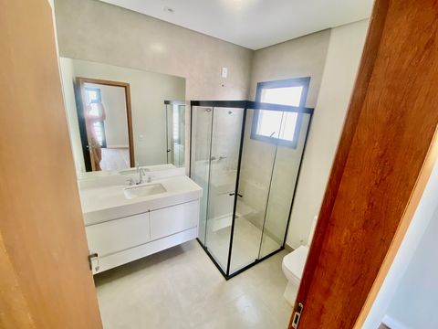 Banheiros das suítes com bancadas em branco prime, escritório no piso superior, infraestrutura de ar condicionado na casa toda, aquecimento solar já instalado com boiler de 600L. Sala principal com pé direito duplo, lavabo, sala e cozinha integrados em conceito aberto toda planejada.