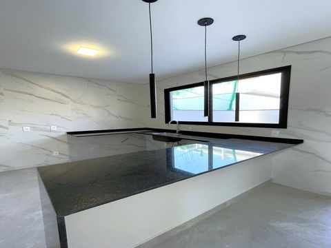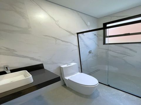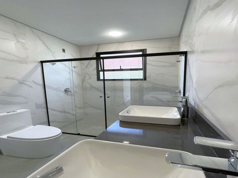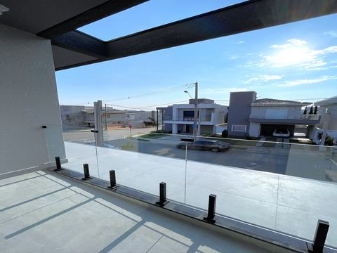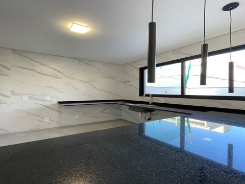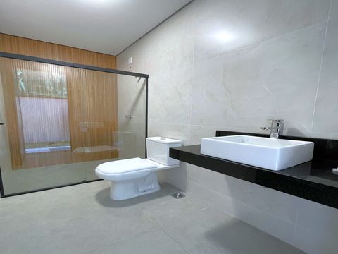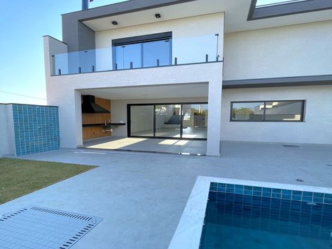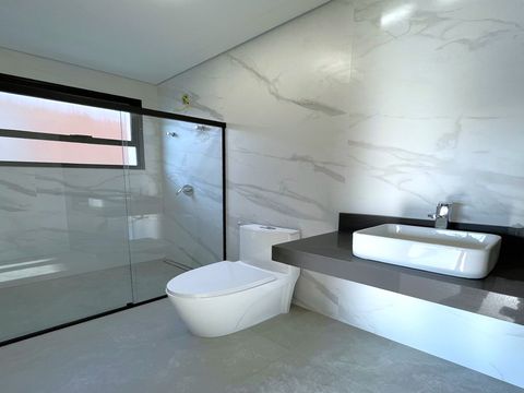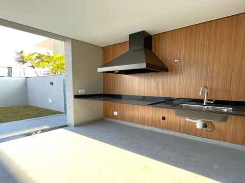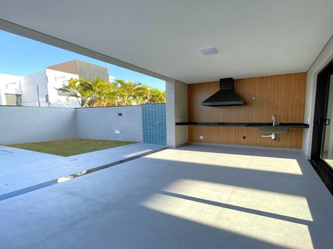 A casa tem design moderno e a proposta foi trazer ambientes integrados. O acabamento é muito bem feito, com materiais de alta qualidade e alguns diferencias como persianas blackout automatizadas, espaços pensados para escritório, roupeiros, adegas e já há infraestrutura para ar-condicionado e aquecimento solar, sendo os cômodos divididos da seguinte forma: