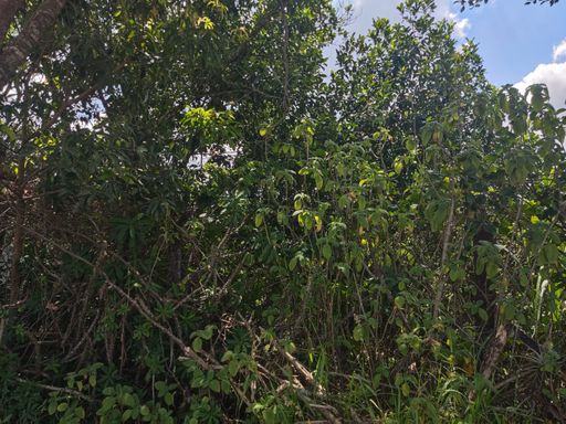 Tereno em declive, poço, várias árvores frutíferas, rua asfaltada e água encanada.