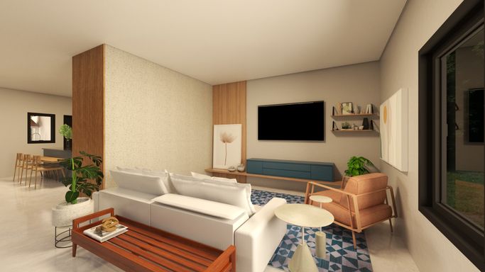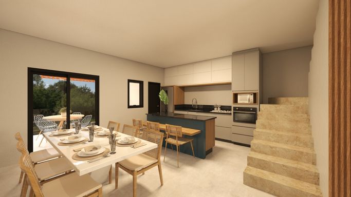 Convivência: Sala de TV integrada e uma moderna cozinha americana que se conecta à sala de jantar, ideal para momentos em família.